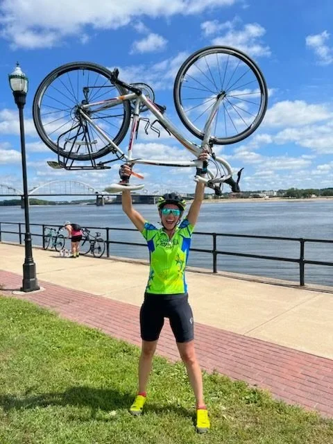 A: This summer I rode 500 miles in 7 days across my home state of Iowa. The ride is called RAGBRAI, and I did it with my husband and 5 other members of my family. I trained for the ride here in Bloomington and got to explore a lot of the surrounding area by bike. It's so beautiful here! The breathing practices I've cultivated through yoga helped me so much in my training. I often found that I intuitively matched my breath with the cadence of my pedaling. 4 pedal rotations often lined up with one inhale, the next 4 rotations with the exhale. I found I was able to get into a rhythm with my breath which helped me maintain consistent speed as well. This was especially helpful when I was working on increasing my endurance.